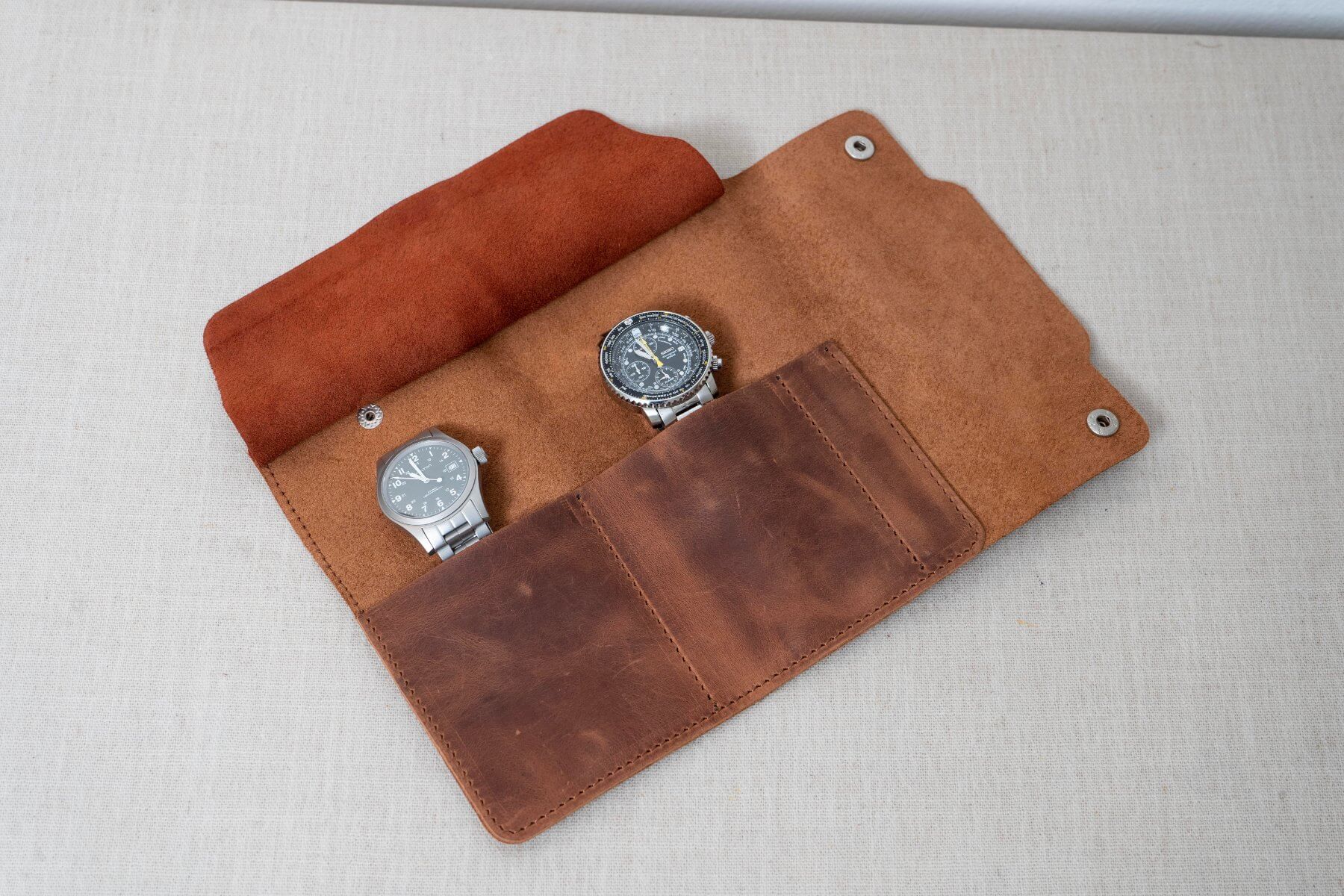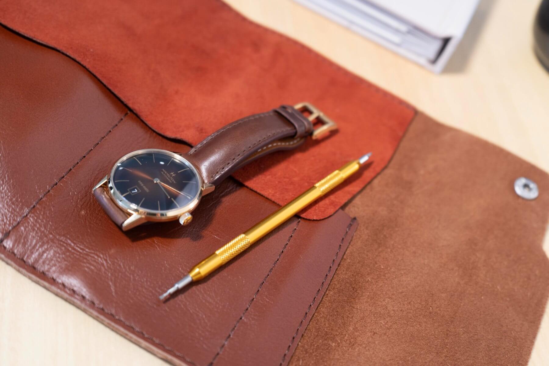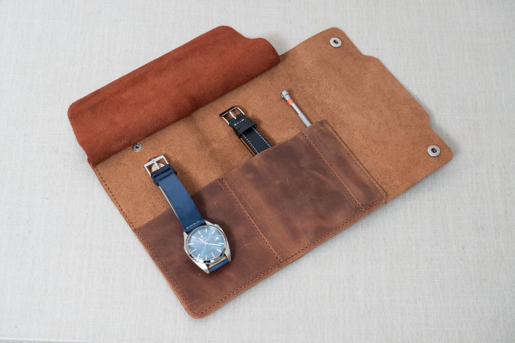 Al abrirlo, revela un interior de gamuza suave pensado para evitar marcas y golpes. Incorpora además un compartimento adicional para herramientas esenciales de relojería, como destornilladores o pasadores, útil para ajustes básicos.